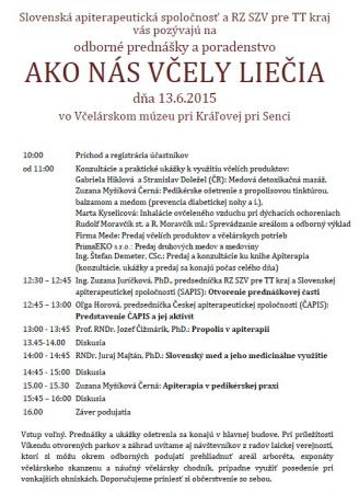 Slovenská apiterapeutická spoločnosť (SAPIS) a RZ SZV pre TT kraj vás pozývajú na odborné prednášky a poradenstvo AKO NÁS VČELY LIEČIA, ktoré sa uskutočnia v sobotu 13.6.2015